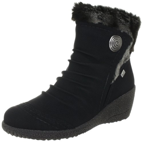 Bottines compensees Rieker Y0363-01 noires La chaussure ideale pour cet hiver ! Une bottine compensee fourree qui allie confort, chaleur , style et qualite, que demandez de plus ? Meme le prix mini nous incite a l eshopper ! Plus d hesitation ! Fermeture par zip sur le cote, talon compense d environ 5,5 cm. Effet plisse permanent sur le dessus. Coloris noir. Ref : D82RIEKER007